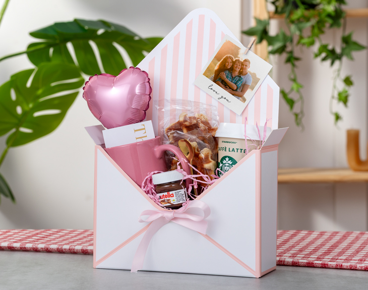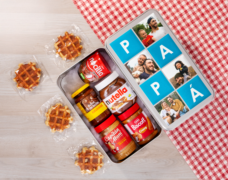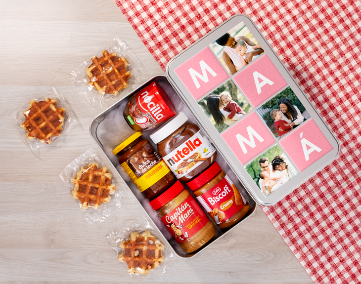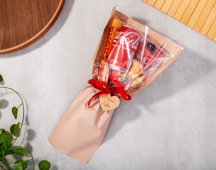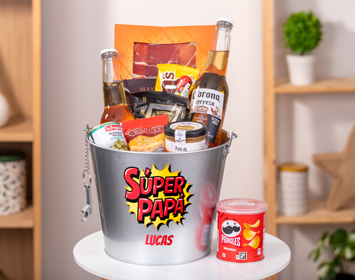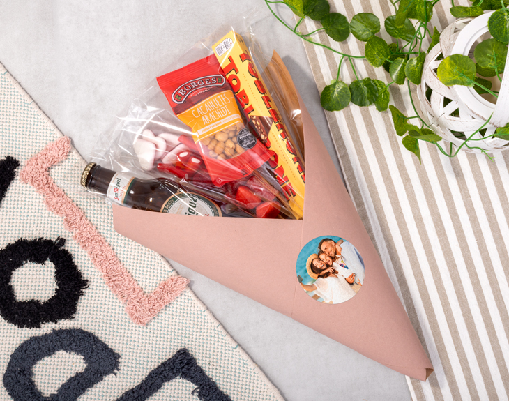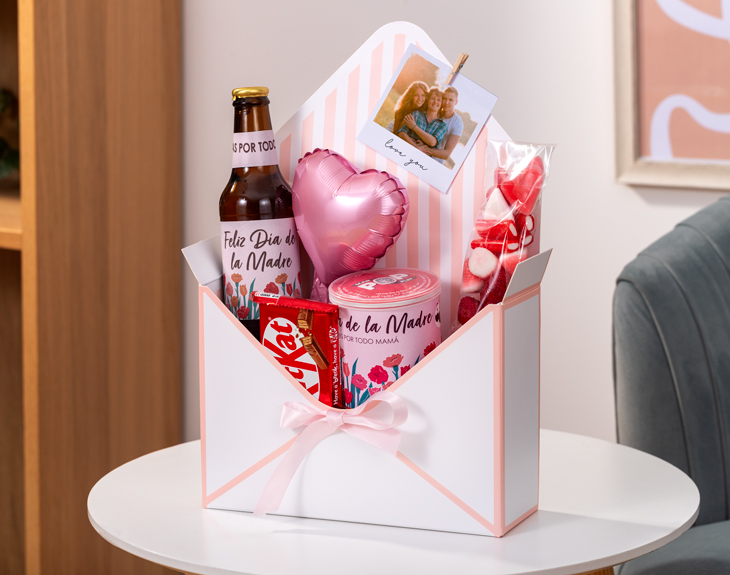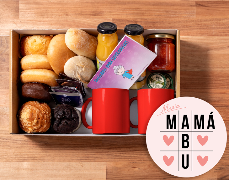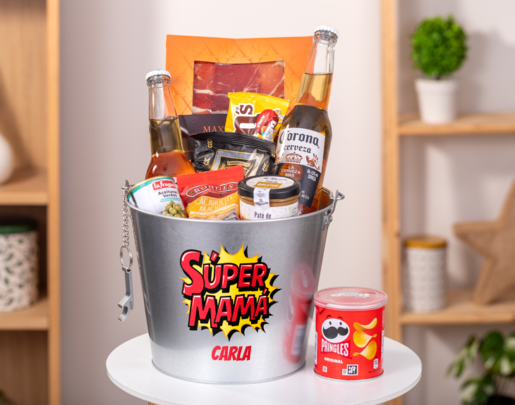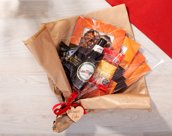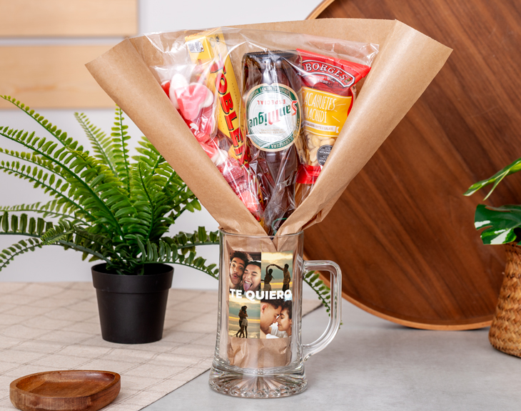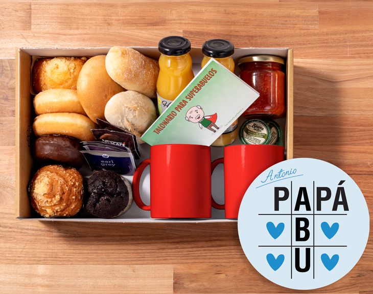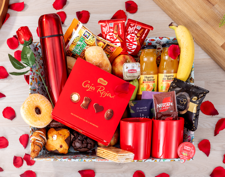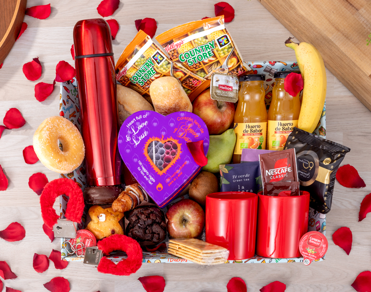 Usando una cesta de mimbre como base, en ella encontrarás productos riquísimos: bollería artesanal, tostadas, zumos ecológicos... Además, muchas otras cosas que podrás conservar como recuerdo, como un termo o una taza personalizada.
